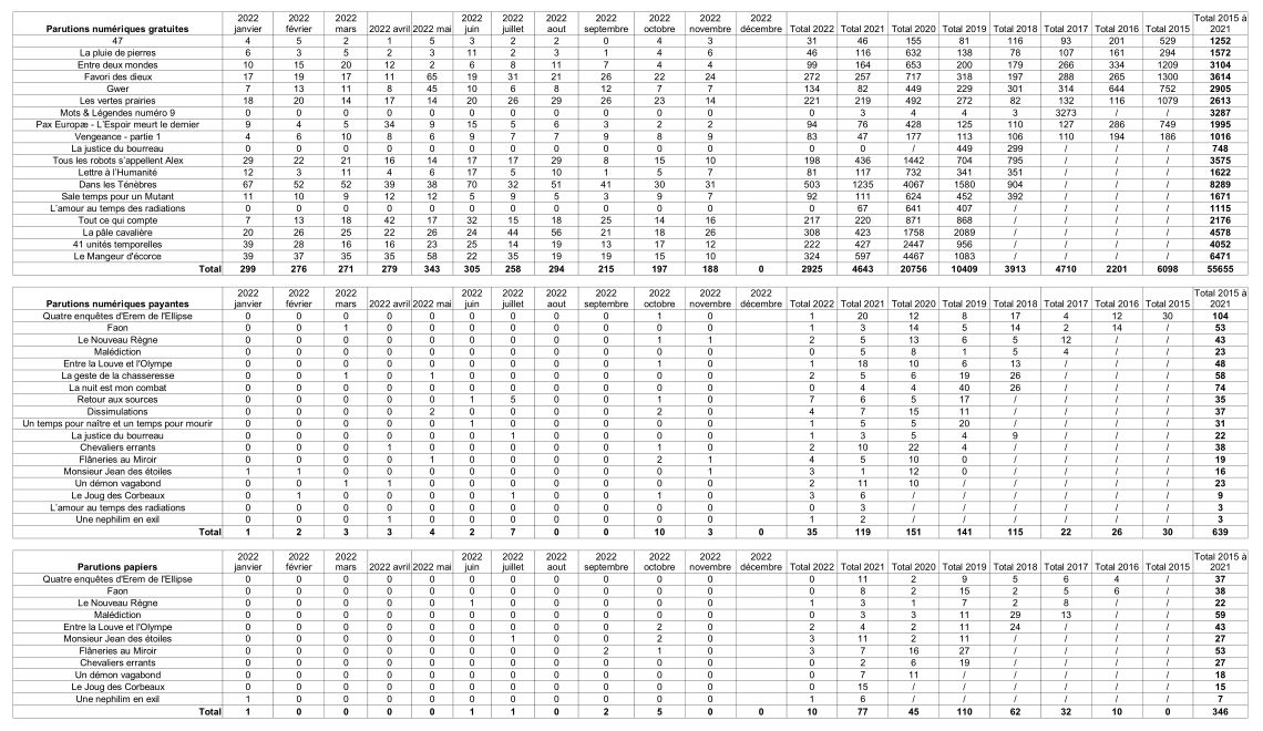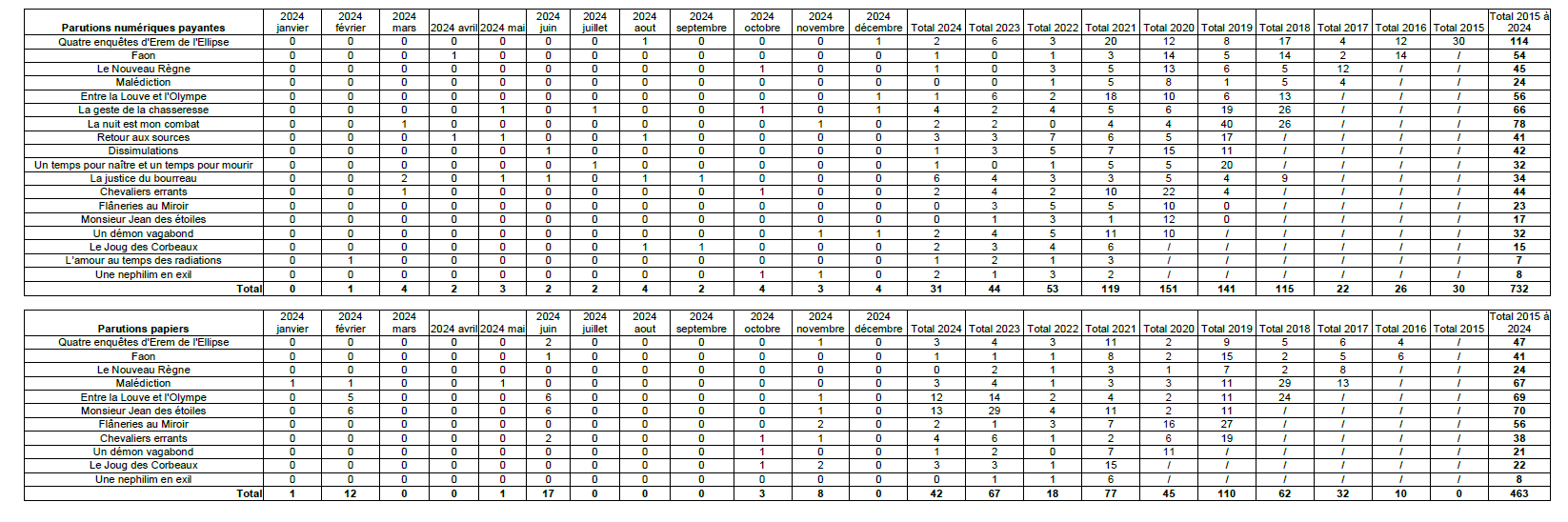 Pour rentrer dans le vif du sujet, les chiffres du bilan parlent d'eux même. 2024 aura encore été une année difficile pour Mots & Légendes. Les raisons restent globalement les mêmes que l'année précédente : un travail alimentaire exigeant en temps et énergie, ce qui réduit la disponibilité pour d'autres projets.
