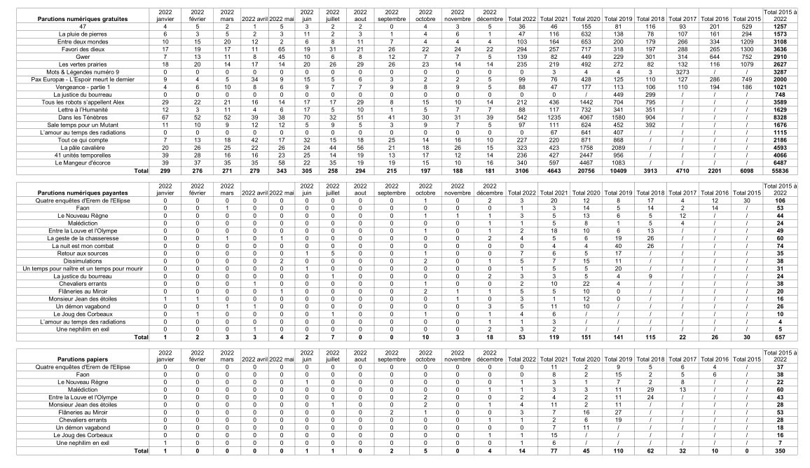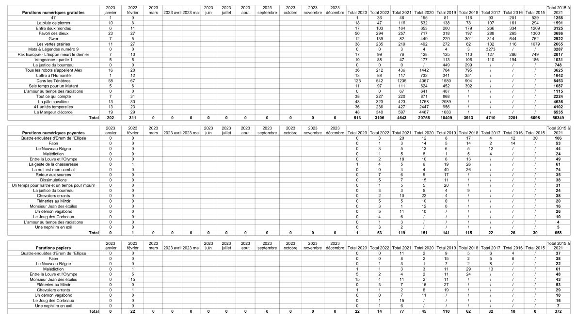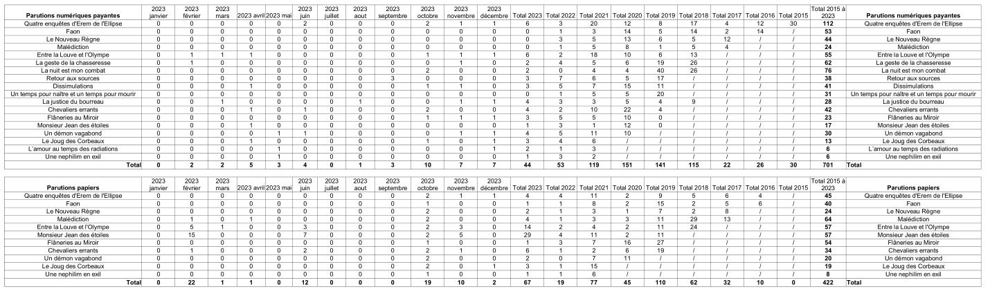En attendant, je vous mets ci-dessous un bilan des ventes papier et numérique de l'année 2023. Si on compare à l'année 2022, l'année aura été plutôt bonne pour les ventes des livres en version papier. Cette hausse est essentiellement due à la présence de Kevin Kiffer en festival qui a vraiment très très bien vendu.